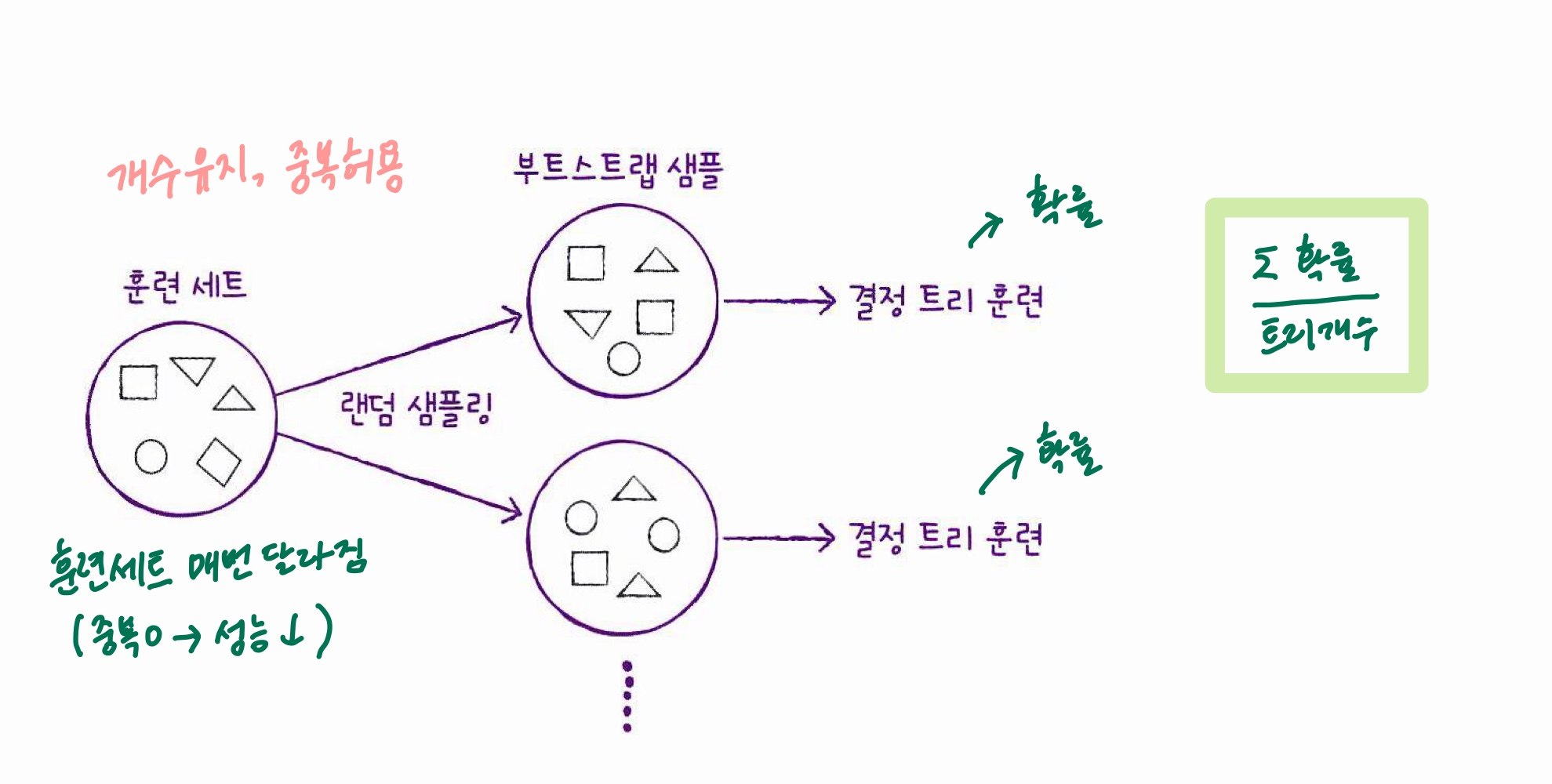 : Ⓐ+Ⓑ로 개별 트리에 무작위성을 부여해서 트리의 성능이 너무 강력해지는 것을 막음 (=과대적합 방지) → 물론 개별트리의 성능은 떨어짐 but 그걸 여러 개 묶어서 일반화하면 높은 성능이 나오게 됨!