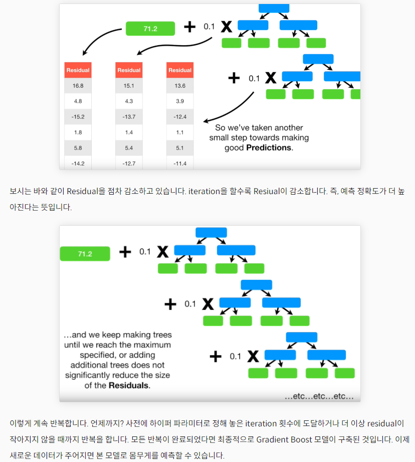 보통 GB가 랜덤 포레스트(RF)보다 좀 더 높은 성능을 내지만, 트리를 하나하나 추가하기 때문에 훈련속도가 느리다는 단점 존재