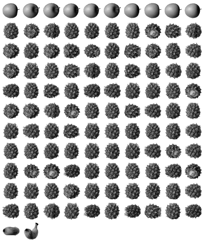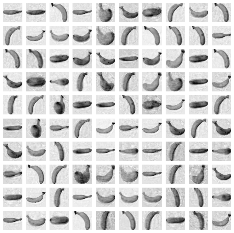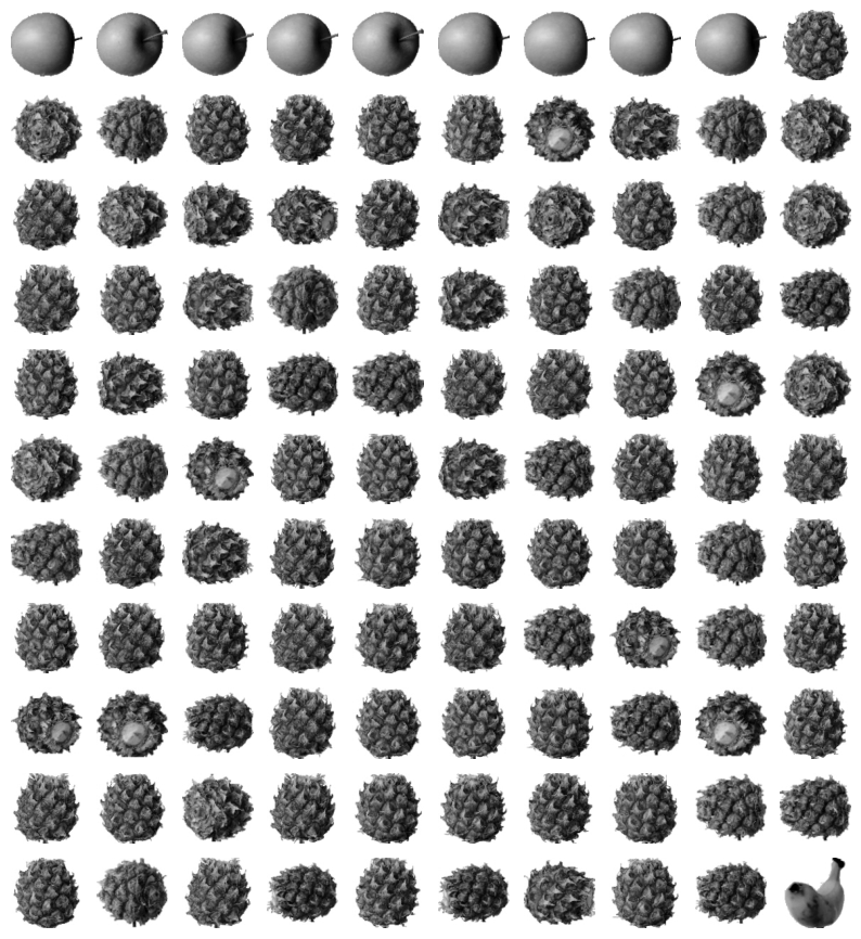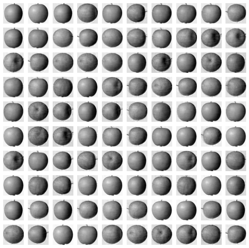 fruits_reconstruct = fruits_inverse.reshape(-1, 100, 100)
