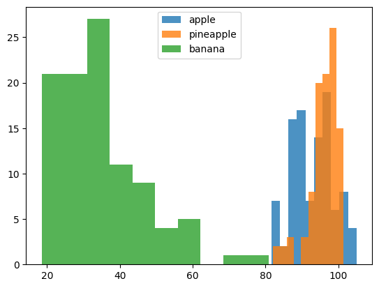 alpha: 그래프 투명도 설정plt.legend: 범례 첨부 설정plt.hist(np.mean(apple, axis=1), alpha=0.8)