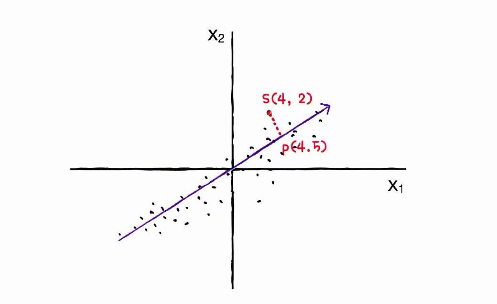 ex) s(4,2)라는 2차원 샘플을 "주성분에 투영하면" 1차원 데이터 p(4.5)로 만듦