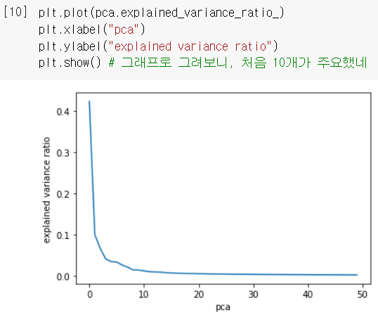 => 처음 10개가 주성분을 가장 많이 설명, 주요했음을 알 수 있음