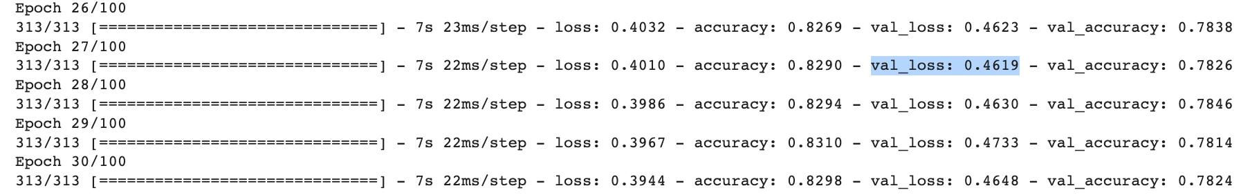 validation loss가 Epoch 27/100 에서 제일 낫기 때문에 조기종료