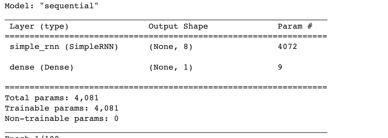 모델의 파라미터는 입력 토큰 500개 x 순환층 뉴런 8개 + 은닉상태 크기 8개 x 뉴런 8개 + 절편 8개 = 4072개