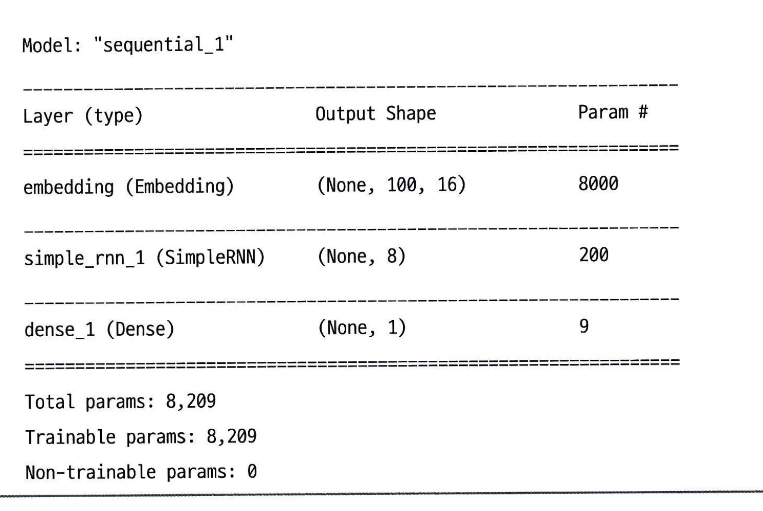 500개 토큰을 크기 16 벡터로 변경하였기 때문에 500x16 크기의 모델 파라미터를 가진다. 뉴런이 8개 이기 때문에 16x8 개, 은닉상태의 가중치 8x8 + 8개 절편 -> 8200개 모델파라미터가 있고 Dense층 9개이므로 8209개