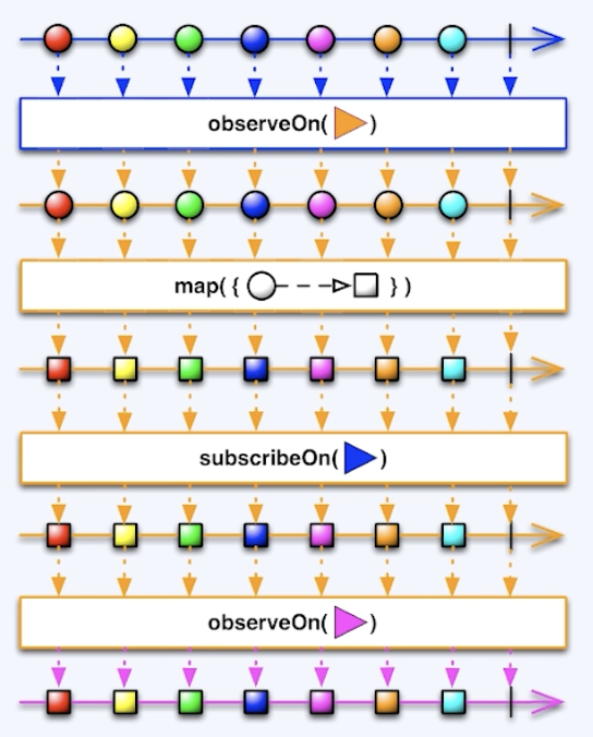 observeOn 은 해당 코드 다음부터 즉, 바로 아래의 시퀀스부터 작동합니다. subscribeOn은 위치에 구애받지 않고 전체적인 옵저버블의 스레드를 변화시킵니다.