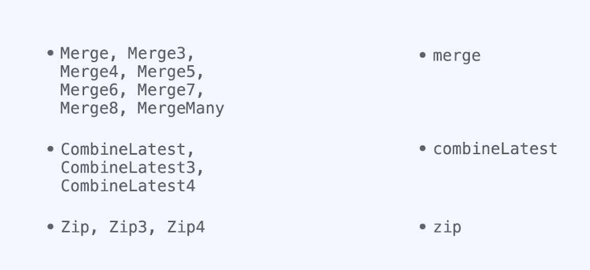 RxSwift에서 제공하는 대부분의 Operator는 컴바인에도 존재하고 명칭이랑 기능도 유사합니다.
