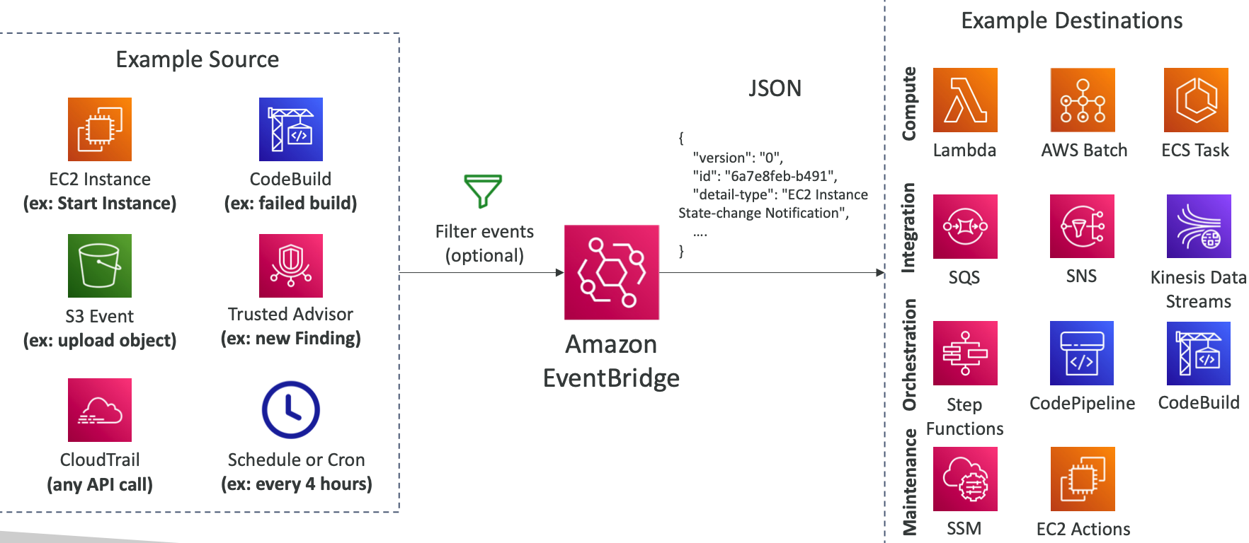 - 이벤트가 발생하면 Lambda 함수 실행, SQS/SNS 메시지 전송 등의 작업을 자동으로 트리거할 수 있습니다.