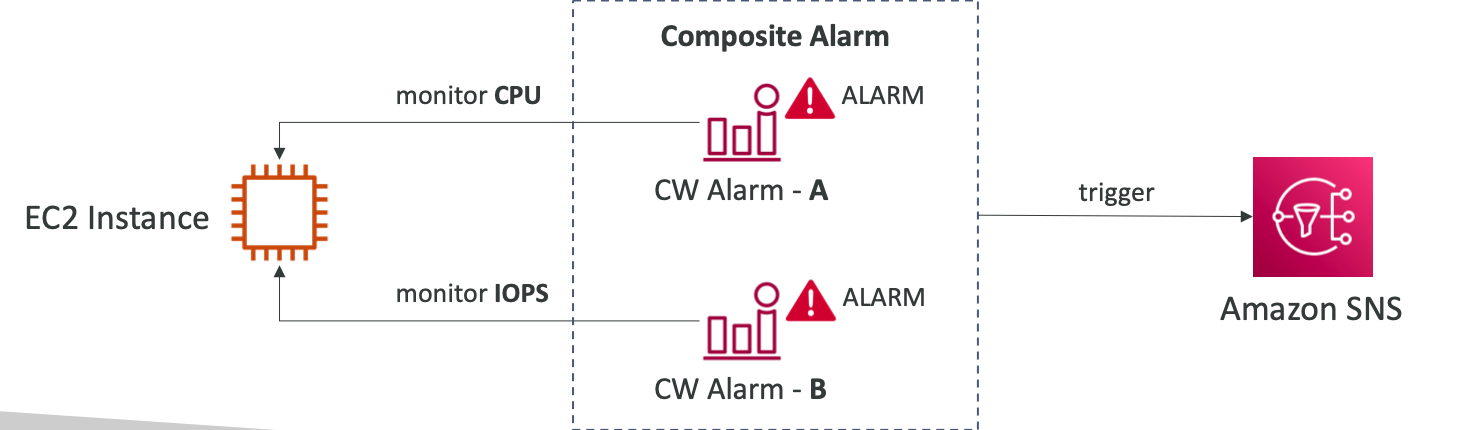 - 예: 두 개의 EC2 인스턴스가 모두 CPU Utilization이 80% 이상일 때만 알림을 보냄.