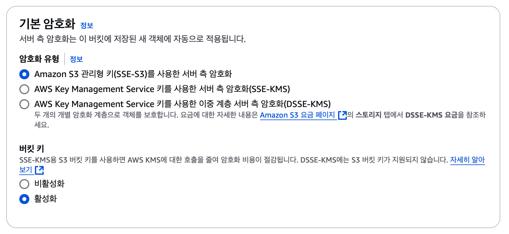 버킷의 암호화는 기본값은 SSE-S3를 사용합니다.