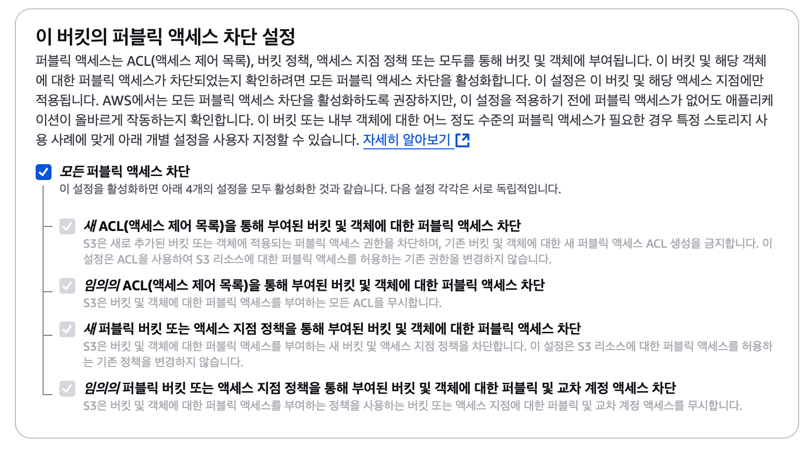 초기 버킷 생성을 할 때 공용 액세스를 차단했기 때문에 접속이 차단되었습니다.