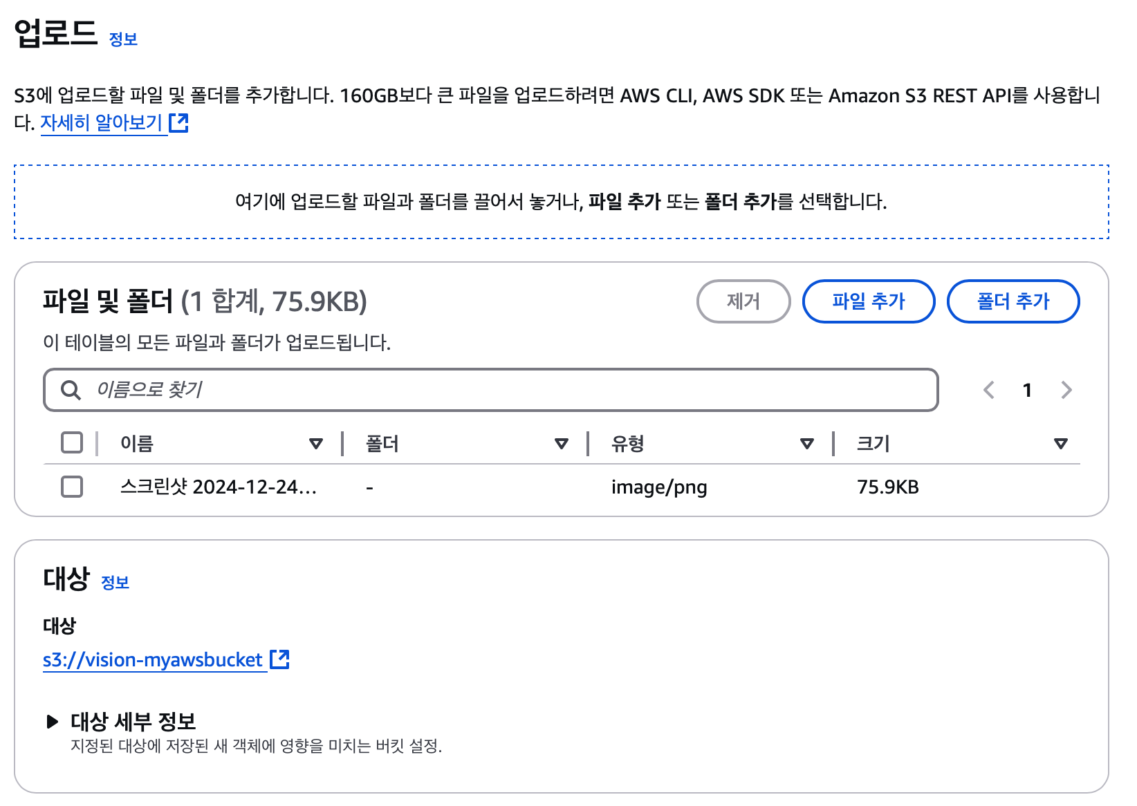 생성된 버킷을 선택 후 업로드 버튼을 누릅니다.