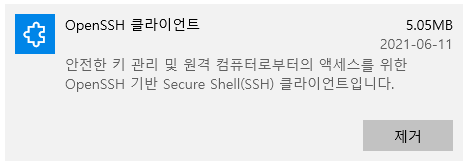 Windows 설정 > 앱 및 기능 > 선택적 기능 > 기능 추가 > OpenSSH 클라이언트