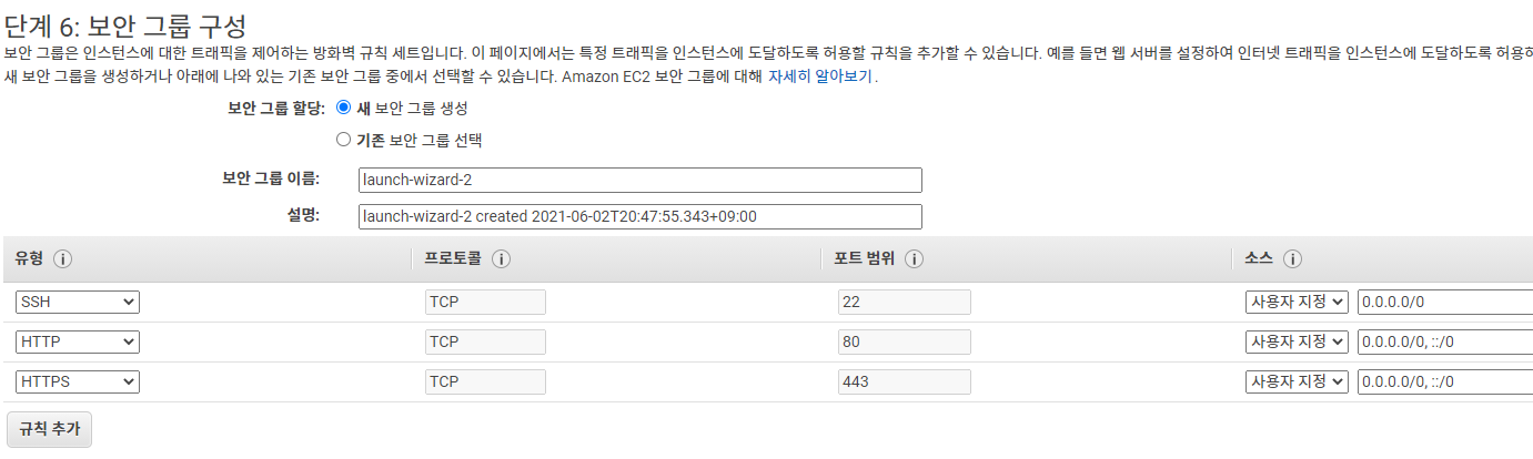 보안 그룹은 규칙 추가를 눌러 HTTP, HTTPS를 추가해줍니다.