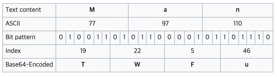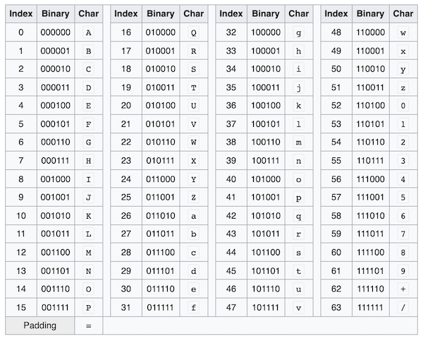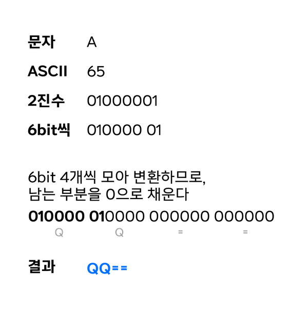 문자열을 ASCII 코드로 변경한 뒤 6bit씩 끊어 변환한다.