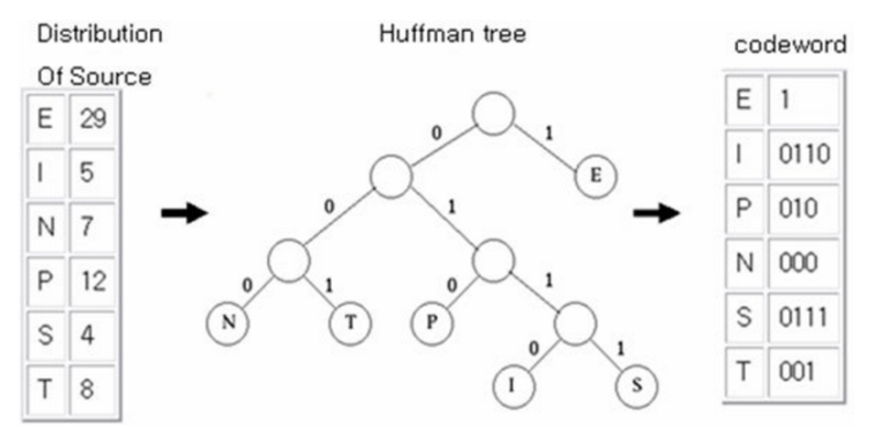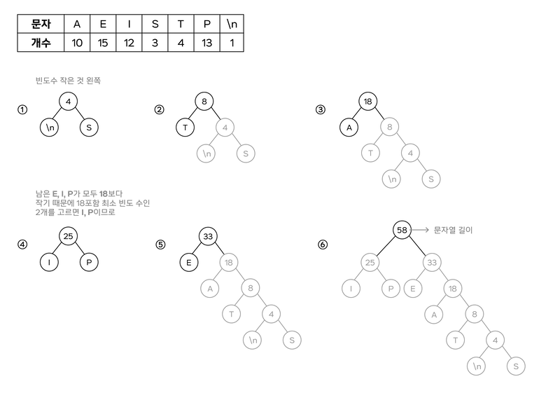 Huffman coding은 문자들의 빈도로부터 접두어 코드를 만들어 내는 알고리즘이다.