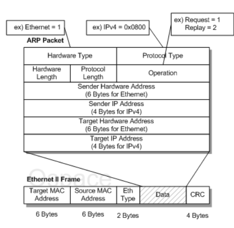 - ARP Request : IP 주소에 해당하는 기기의 MAC 주소를 물어보는 브로드 캐스트 메세지