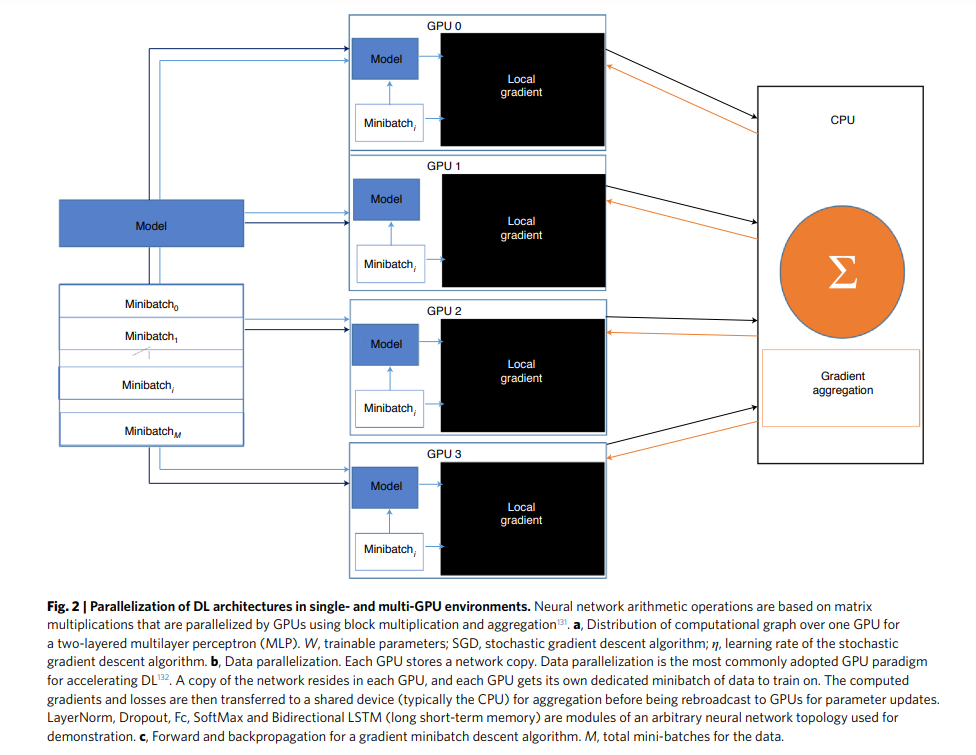 비슷하게 DL 모델 학습은 행렬 변환으로 표현되는 forward/backward passing을 병렬처리를 통해 한다.