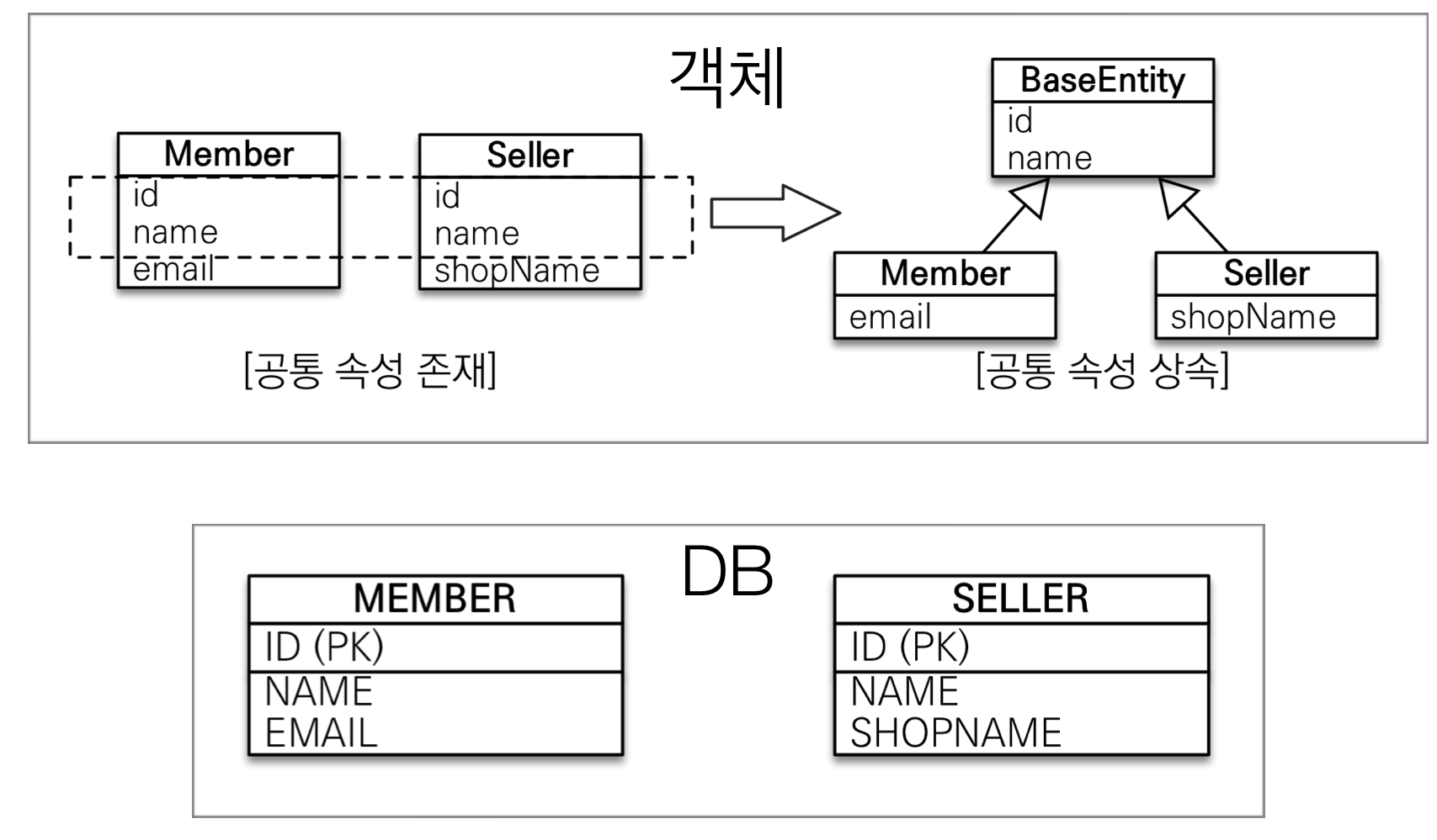 => BaseEntity라는 부모 객체를 만들어 공통 속성을 가지게 하고, Member와 Seller가 상속 받게 함
