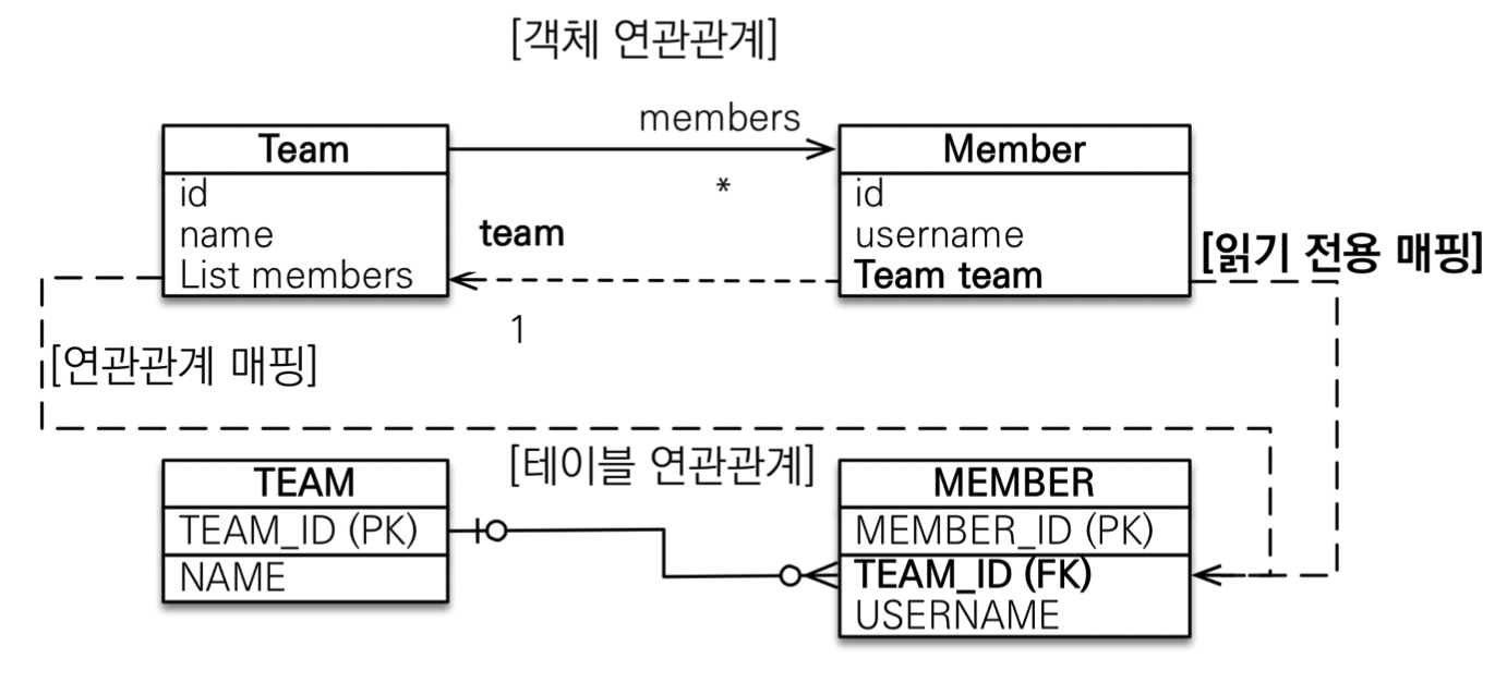 @JoinColum(insertable=false, updatable=false) // 읽기 전용 매핑
