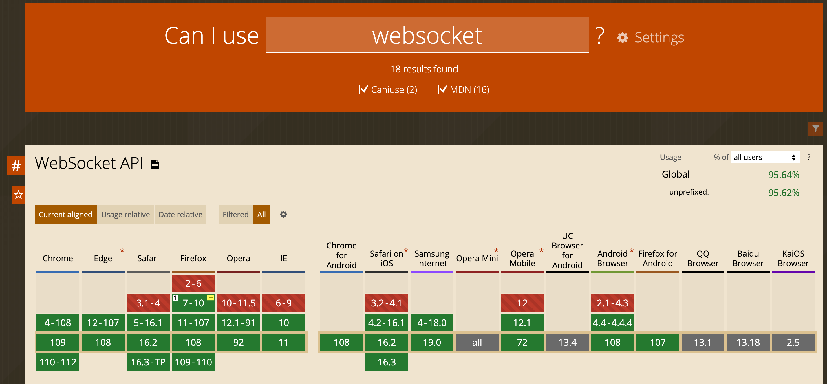 많은 환경에서 웹 소켓을 지원하지만, 브라우저 구버전 등에서는 모두 지원하지는 않음