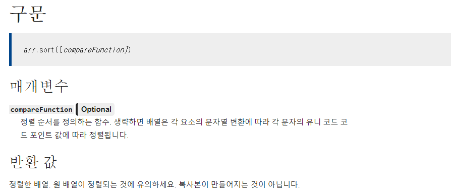 문자열로 바꾼 뒤에 정렬이 이루어지기 때문에 숫자 정렬에 적합하지 않아서 compare function 을 작성해준다.