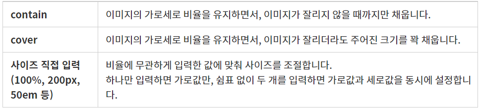 (여기서 contain과 cover 는 object-fit에서 쓰는 속성과 결과물이 동일.)