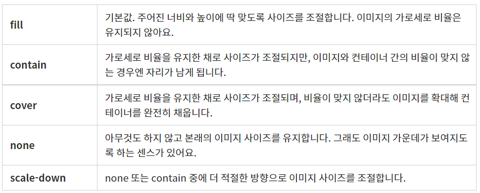 img 나 video 같은 오브젝트의 사이즈를 컨테이너의 크기에 맞춰 조절할 수 있다.