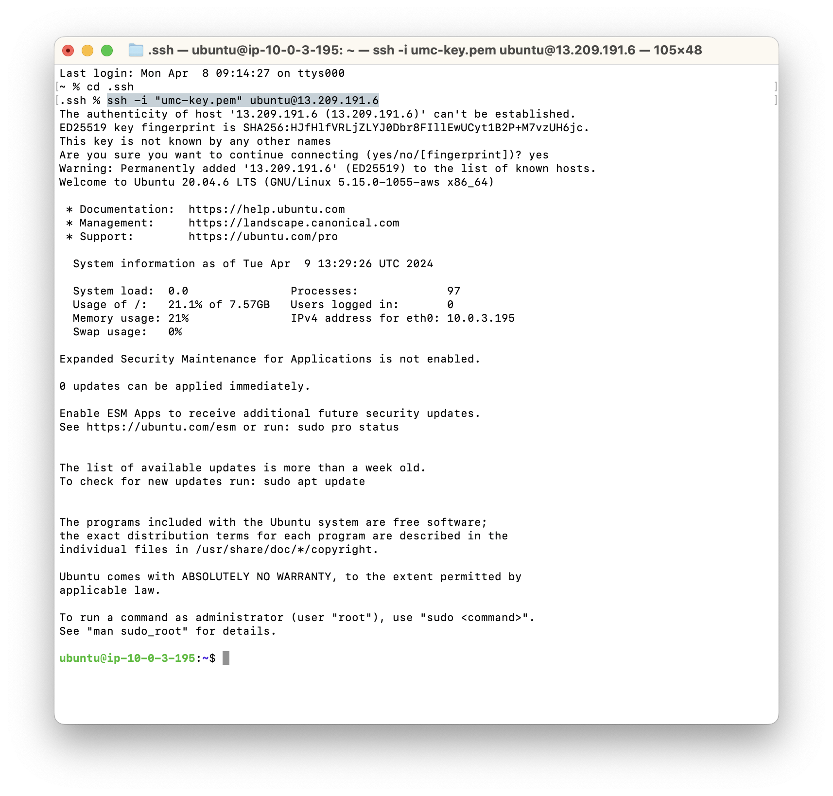 $ ssh -i "[pem 키 이름].pem" ubuntu@[탄력적 IP 주소]