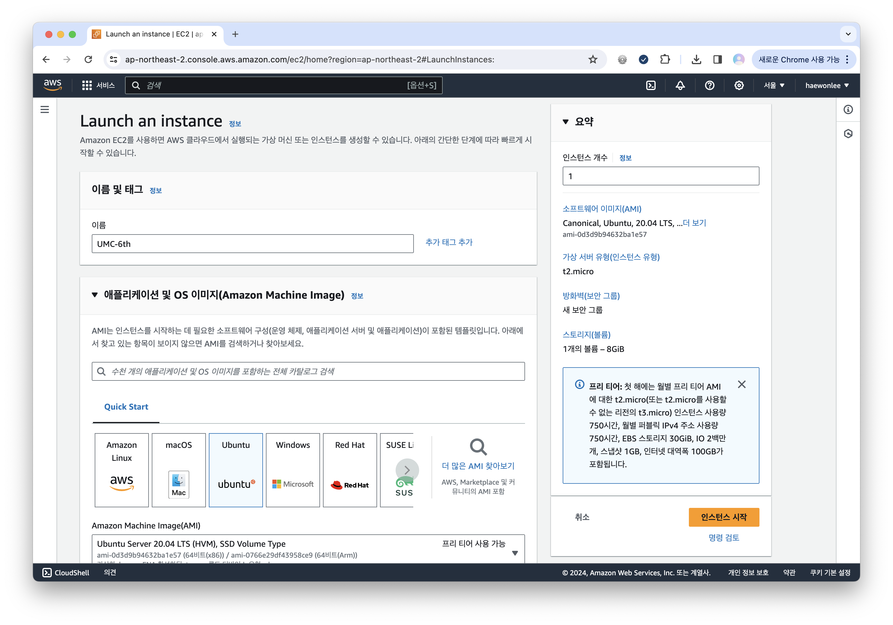 EC2 운영체제를 Ubuntu 20.04 로, 인스턴스 유형을 t2.micro 로 선택했다.