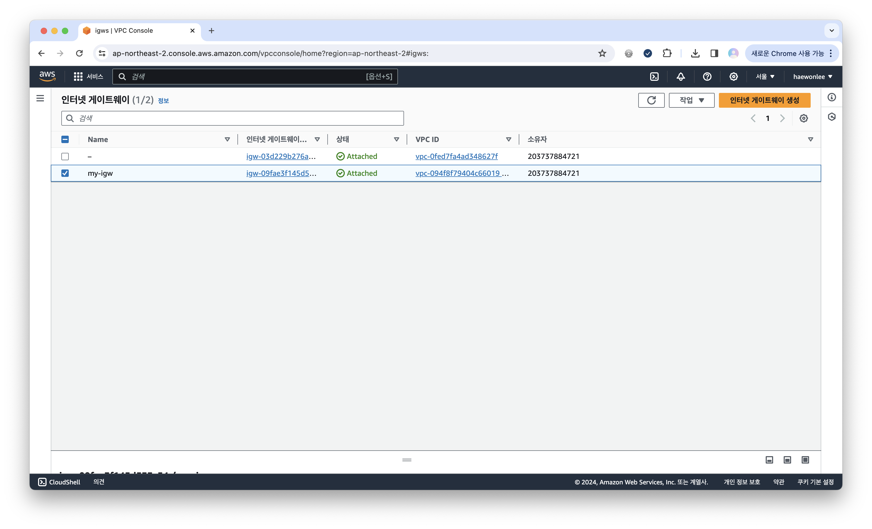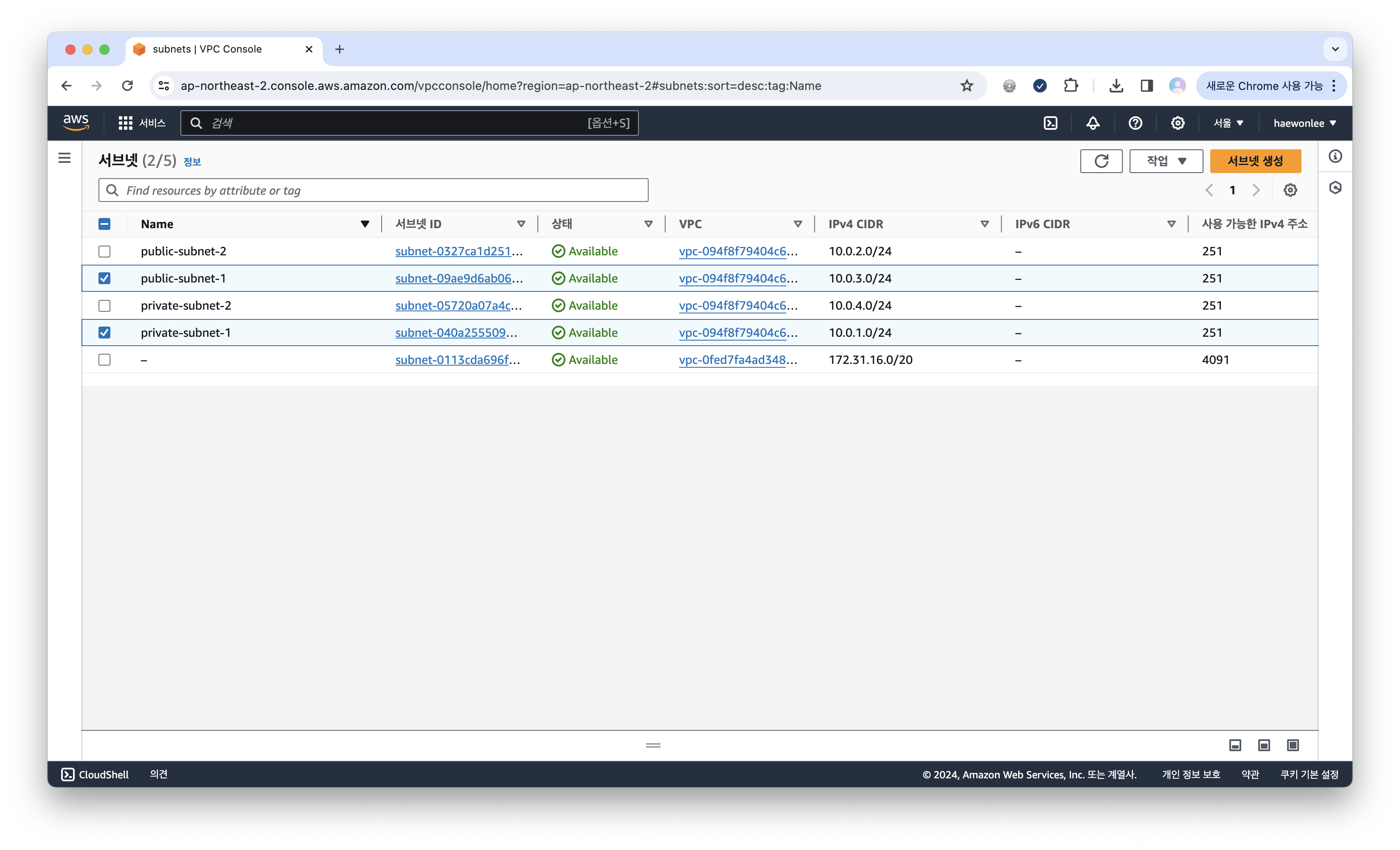 그리고 두 가지 Subnet을 생성했다. 하나는 IGW를 연결할 public-subnet-1, 다른 하나는 private-subnet-1 이다.