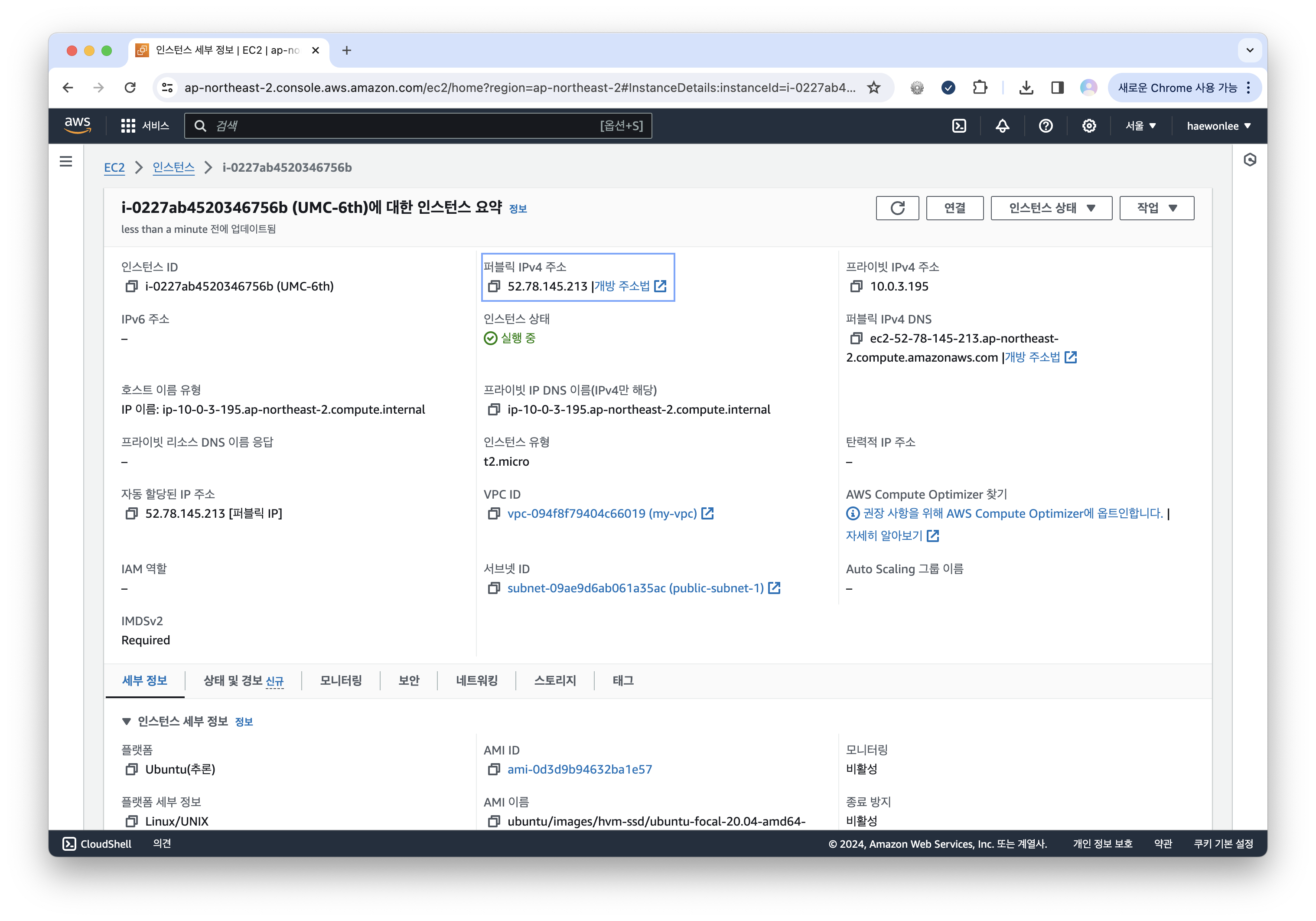 이렇게 생성된 EC2는 Public IP 자동 할당 설정을 했기 때문에 IP 주소가 할당이 되지만, EC2를 중지 후 재실행하게 되면 Public IP가 변경된다.
