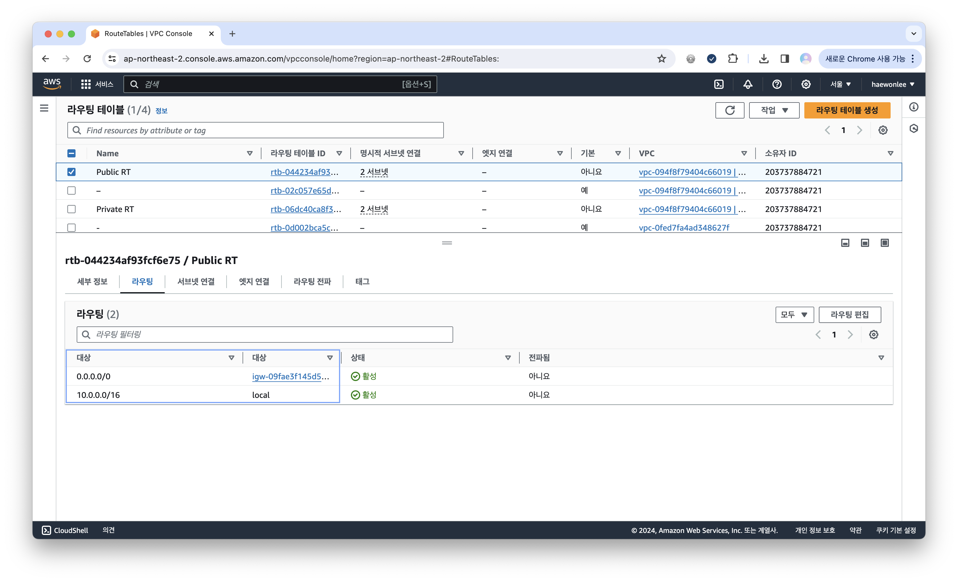 또한, 라우팅 테이블 설정을 아래와 같이 해야 Public Subnet이 외부와 통신할 수 있다.