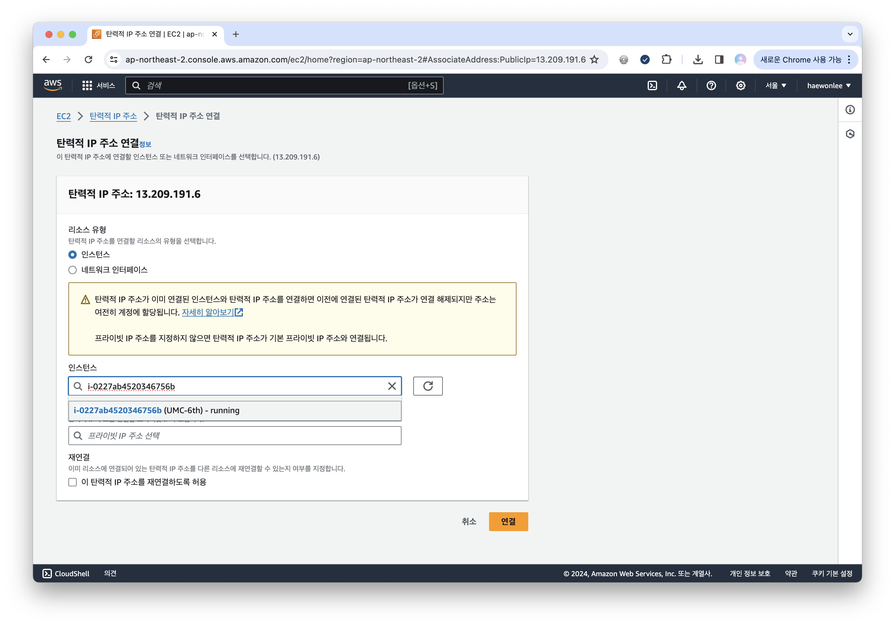 탄력적 IP는 생성 후, 탄력적 IP 주소 연결을 해야 한다.
