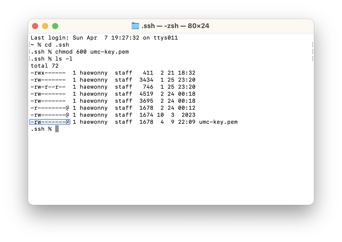 먼저, 앞서 생성된 pem 키를 .ssh 디렉토리로 옮긴 후, 실행권한을 변경해 주어야 한다.