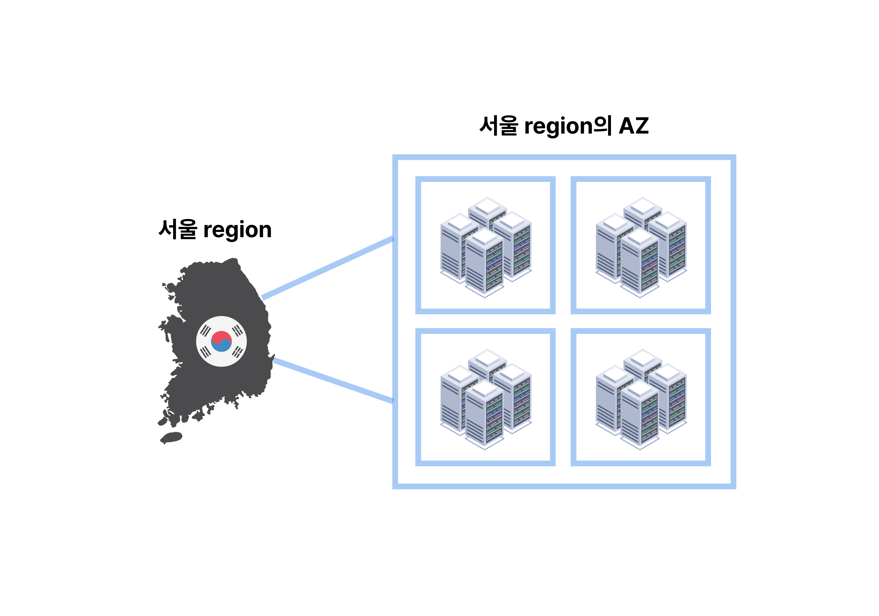 뒤에 이어질 실습에서 리전을 선택한 후에는 VPC를 생성하게 되는데, 리전에서 VPC를 만들면 자동으로 VPC 안에 모든 가용 영역이 포함된다.