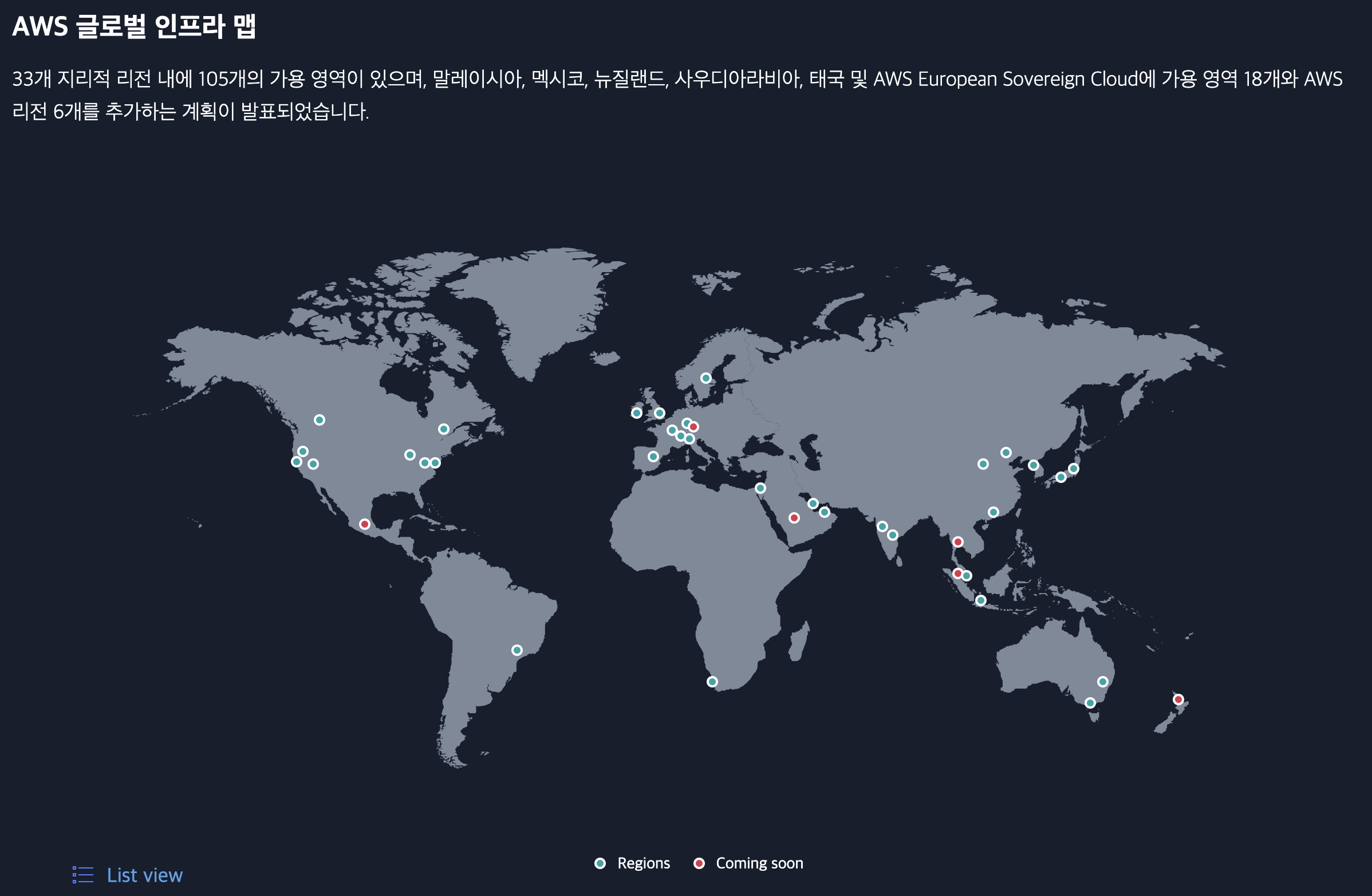 위 이미지는 AWS가 현재 어떤 리전에서 서비스를 하는지 나타낸다. 현재 33개의 지리적 리전을 가지고 있다고 한다! 👍🏻