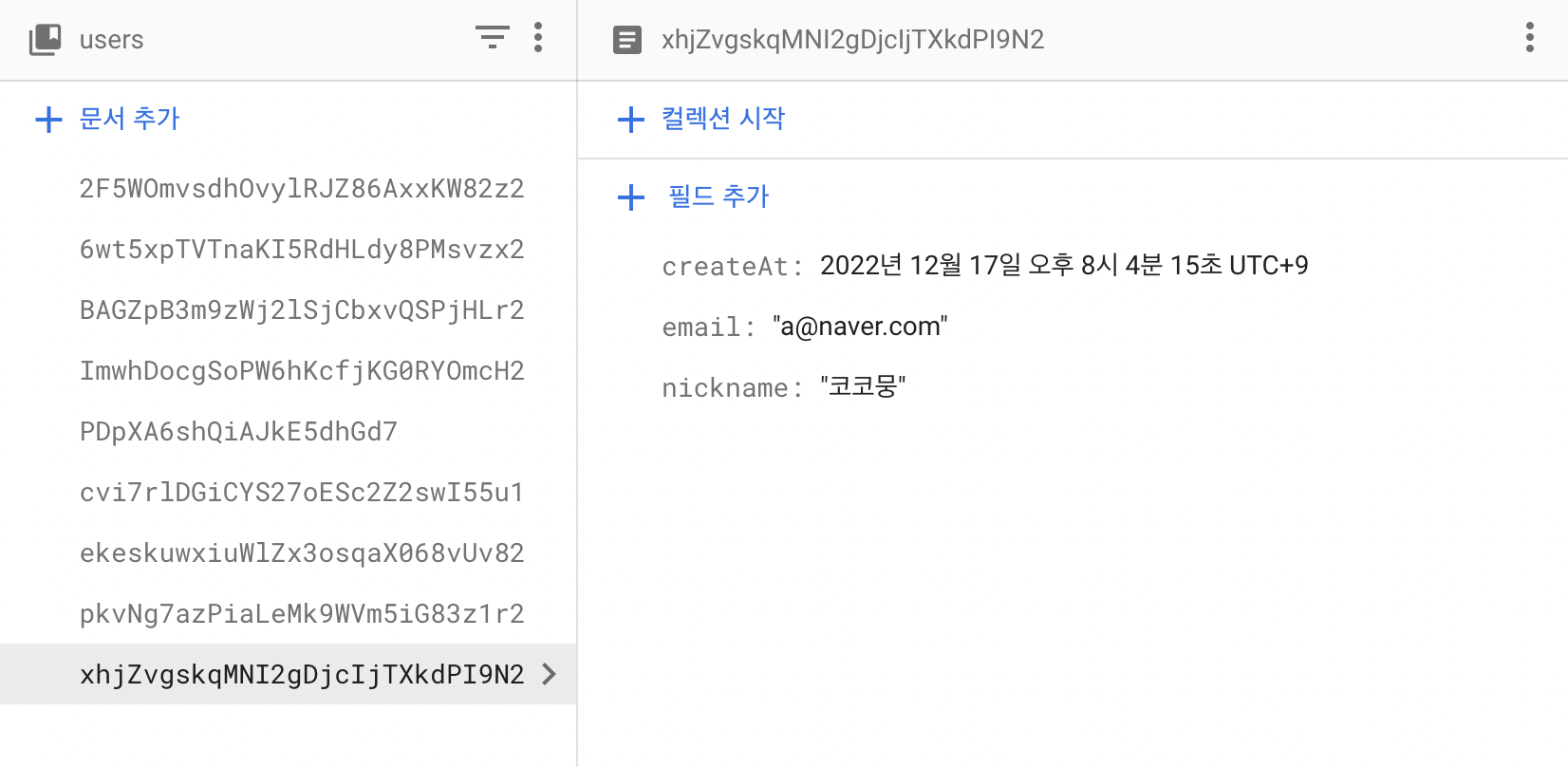 user 데이터는 사진과 같이 계정 생성 날짜, 이메일, 닉네임이 저장된다.