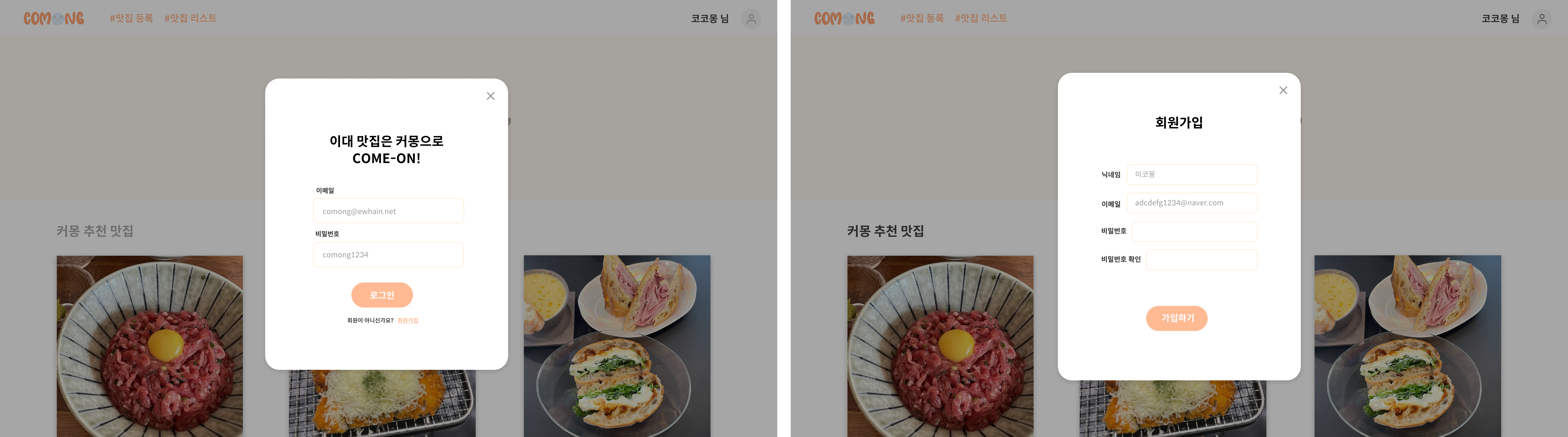 로그인, 회원가입 기능은 모두 모달창 안에서 수행된다.