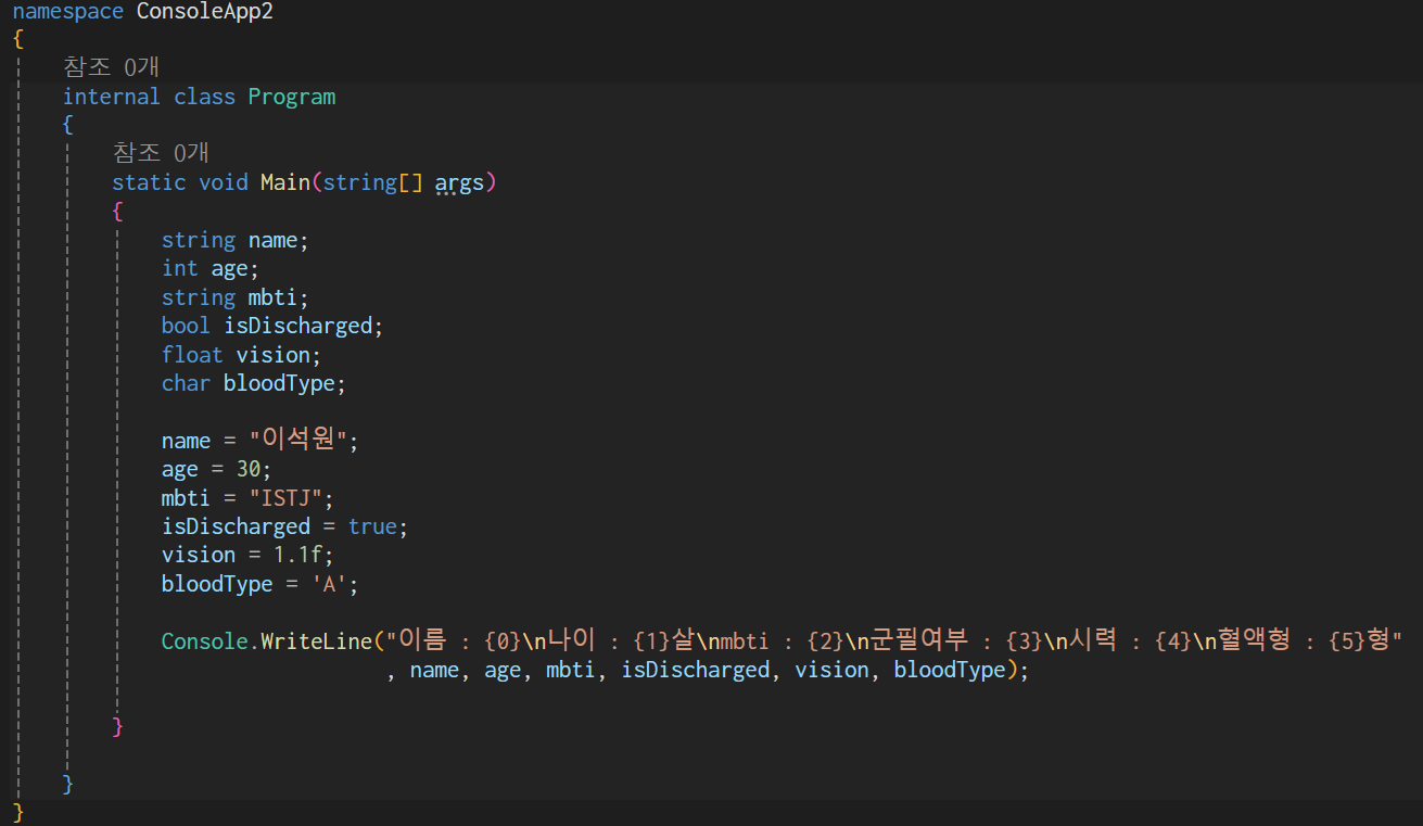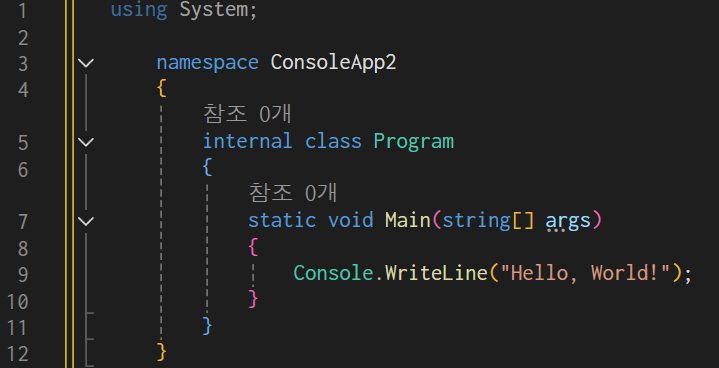 이때 namespace는 독자적인 개발 공간을 의미하고 위의 코드는 ConsoleApp2이라는 공간을 새롭게 정의하고 해당 공간에서 개발을 할 것이라고 컴퓨터에게 말해주는 것이다.