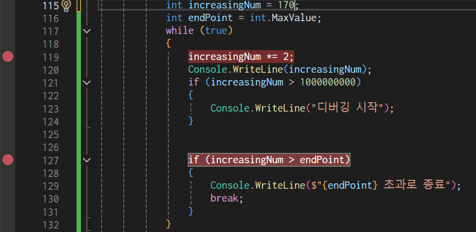 조건문과 반복문의 사용이 많아지면 논리 오류를 한 눈에 파악하기 힘들다. 이때 Visual Studio에 디버거 기능을 활용하면 구간 별로 디버그 과정을 진행할 수 있다.