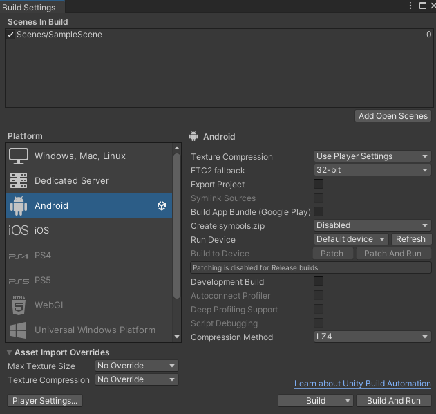 Build Setting -> Android 'Switch Platform'Switch Platform 이후 빌드를 할 때 Build And Run을 누르면 자동으로 빌드 파일이 생성되고 연결된 AR 기기에 설치 이후 실행까지 된다.