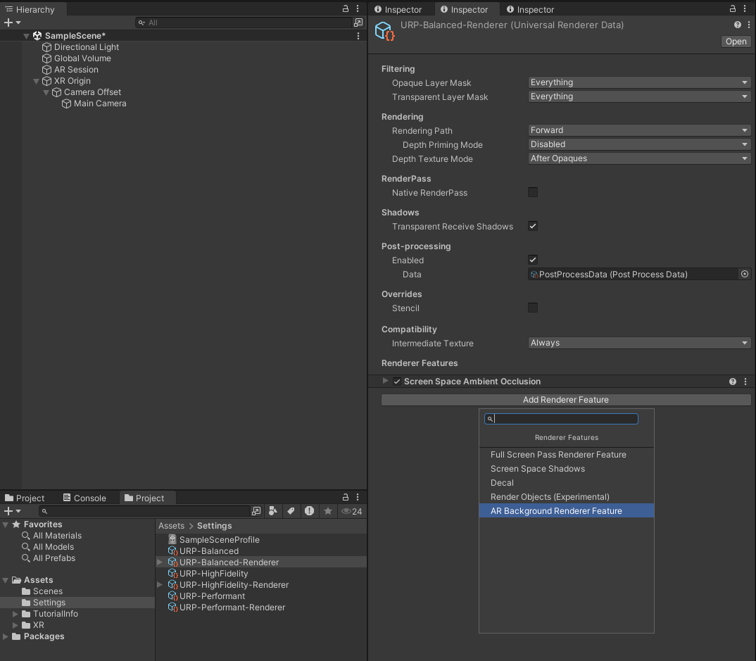 URP Renderer Quality 확인 -> AR Background Renderer Feature 추가해당 설정까지 마치고 빌드를 하게 되면 설치된 파일을 AR 기기에서 실행시켰을 때 기기의 카메라로 비춰지는 화면이 나타나게 될 것이다.