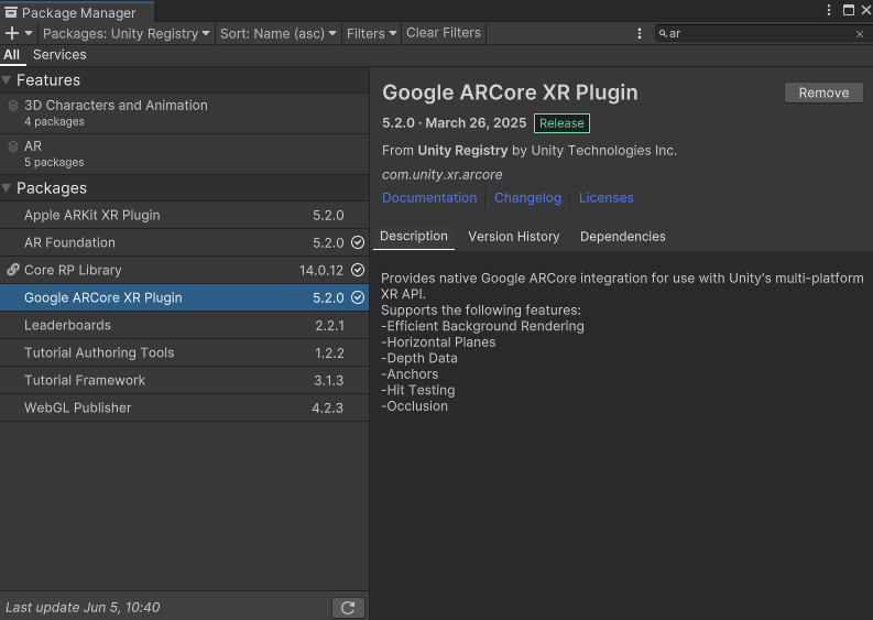 Package Manager -> AR Foundation, Google ARCore XR Plugin 설치