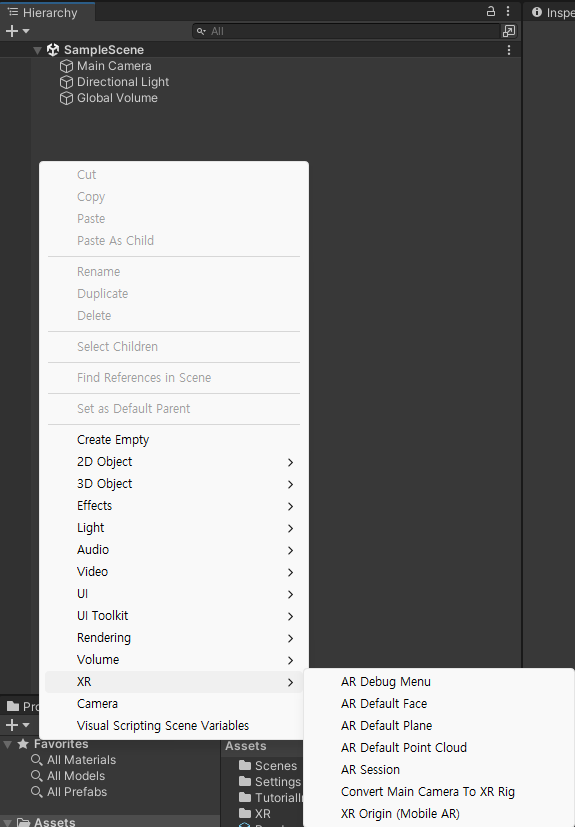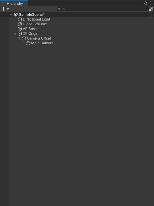 XR -> AR Session, XR Origin (Mobile AR) 추가AR Session : 모바일 기기와의 통신, AR 컨텐츠가 구동되기 위한 핵심적인 역할