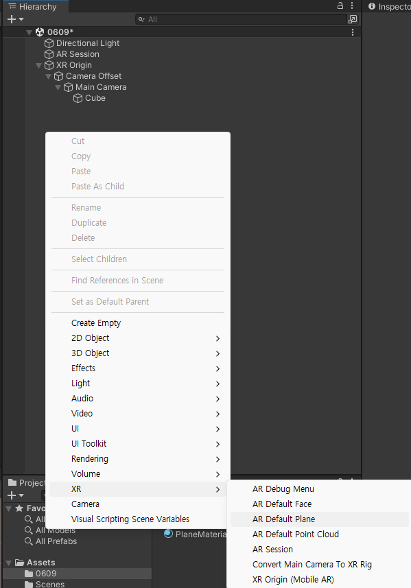 다음 하이어라키 창에서 AR Default Plane을 생성하고