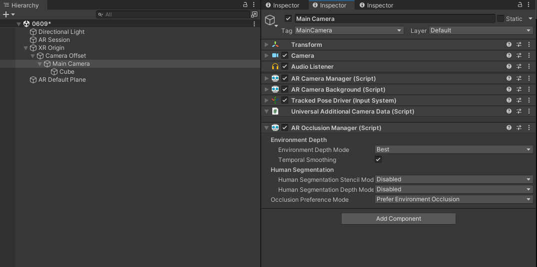 가장 간단한 방법은 XR Origin에 있는 main camera에 AR Occlusion Manager 컴포넌트를 추가하는 것이다. 이렇게 추가만하고 빌드만 해도 앱을 실행했을 때, 현실의 오브젝트가 가상의 오브젝트를 가리는 것을 확인할 수 있다.