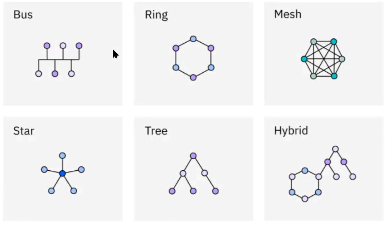 Network Topology네트워크가 연결, 배치되어있는 형태를 의미한다. 연결 방식에 따라 데이터의 흐름, 전송 속도 등이 상이하며 상황에 따라 적합한 토폴로지를 적용시켜야할 필요가 있다. 한 서버가 마비되었을 때 다른 연결의 차단 여부 또한 토폴로지를 통해 정할 수 있다.