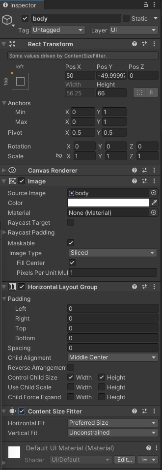 위에서 언급한 대로 말풍선의 크기를 최대로 정해놓고 왼쪽에서 글자가 하나씩 출력되도록 하고자 한다면 먼저 이미지에 추가한 컴포넌트(Content Size Fitter)를 비활성화할 필요가 있다. 말풍선의 크기를 출력될 모든 글자 수로 정해질 것이기 때문에 출력된 글자수에 맞춰서 변동되면 안되기 때문이다. 이후 스크립트 세팅에 사이즈를 결정하는 SetSize() 메서드를 추가한다.