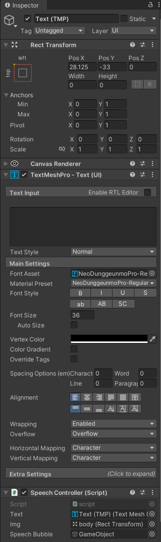 콘솔창에서 대사를 출력하는 것은 굉장히 쉬운 일이었지만, Unity에서 대사를 출력하는 것은 꽤나 손이 가는 작업이었다. script setting의 코드 자체는 비슷했지만 말풍선의 위치를 지정하는 것과 말풍선, 텍스트의 크기를 설정하는 것이 생각보다 까다로웠다.